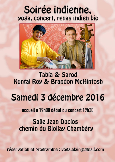 Des musiciens professionnels direct de Calcutta et Seattle nous emmènent en voyage improvisé selon la tradition indienne. Une méditation en musique… Participation 12€ le concert seul, 20€ avec repas. Le repas est à réserver impérativement avant mercredi soir, svp. Ouvert à tous.